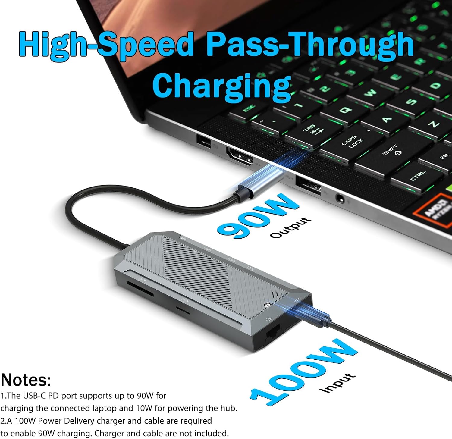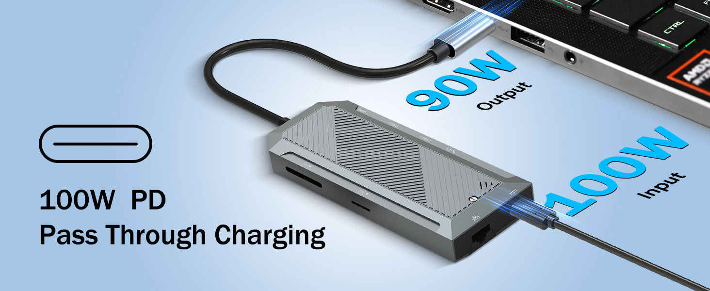 Quvvatni etkazib berishni qo'llab-quvvatlash markazdan foydalanilganda qurilmalar zaryadlangan bo'lishini ta'minlaydi. USB-C PD porti quvvatni hub orqali va ulangan noutbuk yoki planshetga o'tkazish imkonini beradi.
