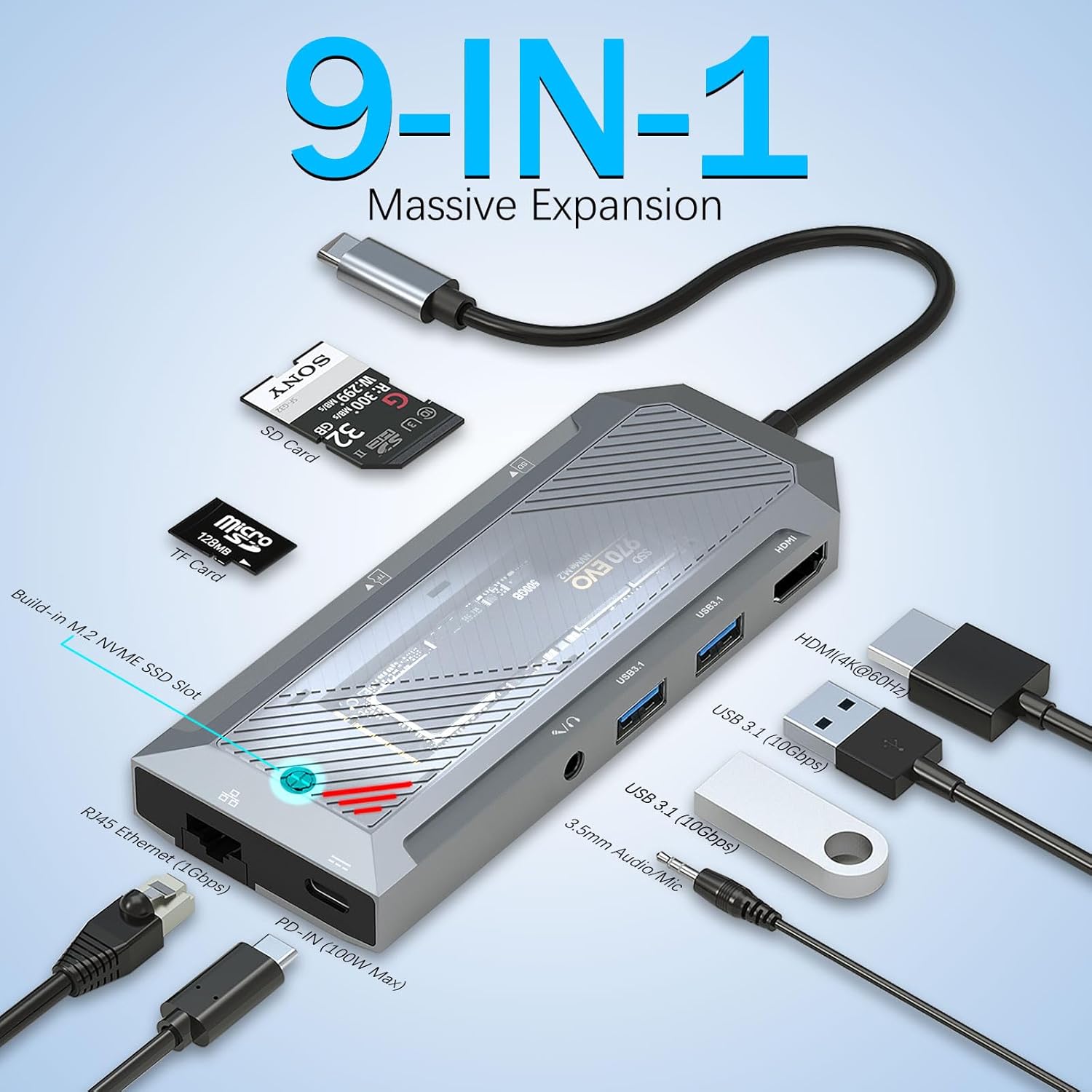 M.2 NVMe 4K 60Hz HDMI Splitter uchun SSD korpusli 9-in-1 USB-C uyasi – eng yaxshi ulanish va yuqori tezlikda saqlashni kengaytirish