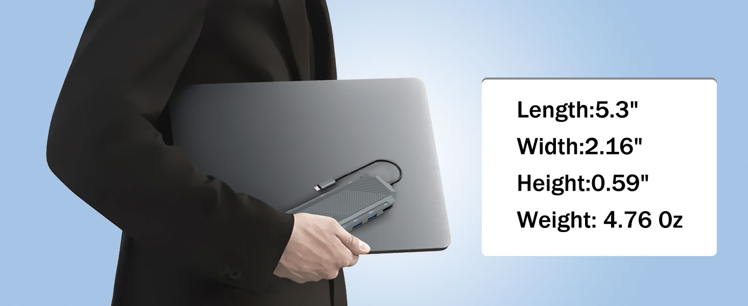 Kuchli funksionalligiga qaramay, M.2 NVMe 4K 60Hz HDMI Splitter uchun SSD korpusli 9-in-1 USB-C uyasi ixcham va engil boʻlib qolish uchun moʻljallangan. Bu uni noutbuk sumkalarida, ryukzaklarda yoki sayohat sumkalarida olib yurishni osonlashtiradi.