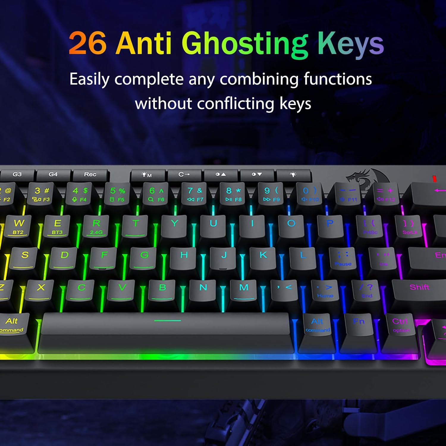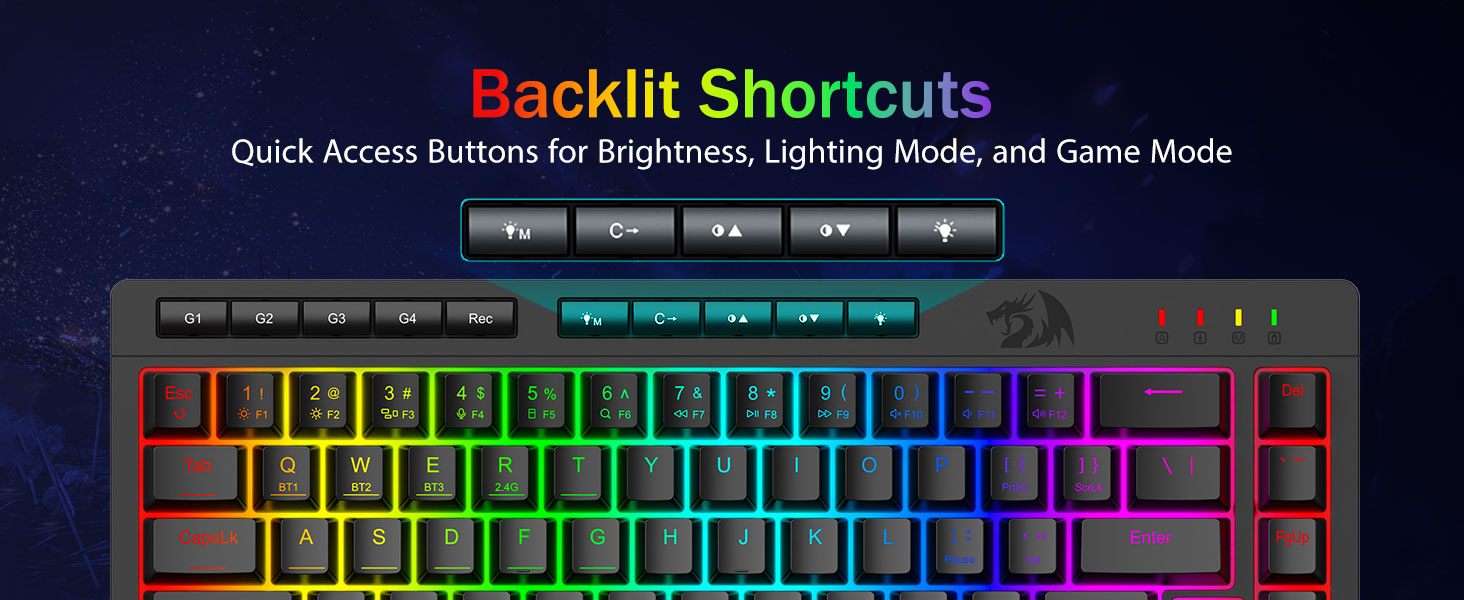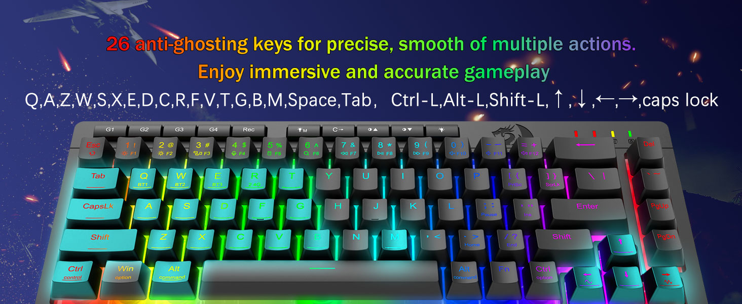Bayramparast o'yin ishlashi va ajratilgan belgini boshqarish -Ahostingga qarshi kalitlar (pastki chiziqli kalitlar), bu sizning uslubingiz uchun tezkor va aniq o'yinning javoblari uchun bir vaqtning o'zida ishlashiga imkon beradigan 26 kalitni o'z ichiga oladi. Yorqinlik, yoritish rejimini va o'yin rejimini tezlashtirish uchun tezkor kirish tugmachalari. Yorqinlik, yoritish profilini tezlashtirish va O'yin rejimini blokirovka qilish bilan.