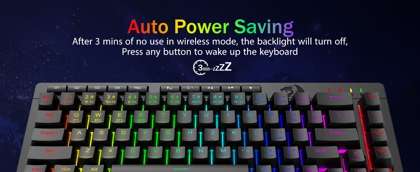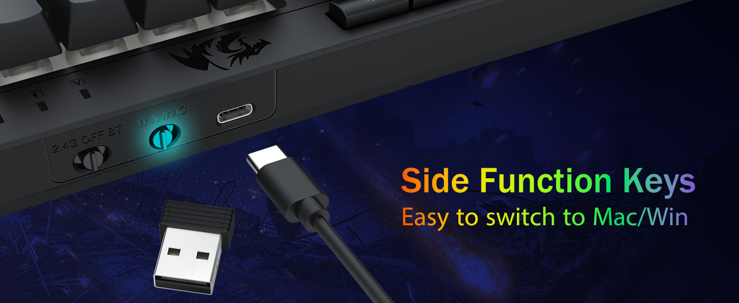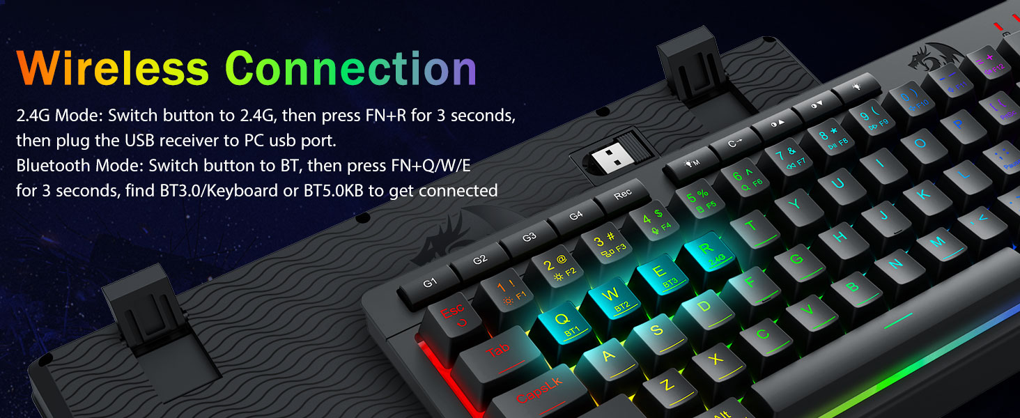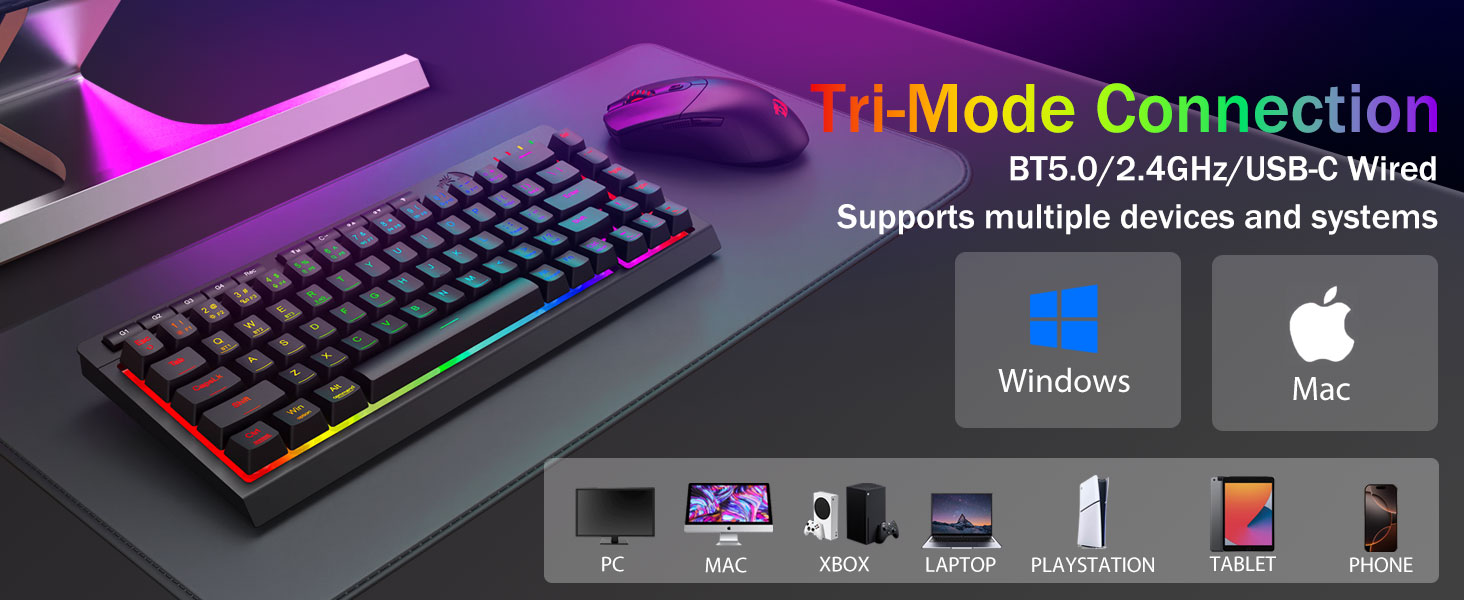 Tri-Mode-Mode va ko'p qurilmaning malakagi -Bluetooth 5.0, 2.4Gh-C simli rejimlari o'rtasida bir vaqtning o'zida 5 tagacha qurilma (kompyuter, Mac, planshetlar, telefonlar, planshetlar, planshetlar, telefonlar, planshetlar, telefonlar, planshetlar, telefonlar ulangan. Imtiyozlar bilan yorliqli tugmachalar yoki Yon tugmachasini gibrid ish / o'yin sozlamalari uchun mukammal tugmachalar orqali almashtiring. 4000ma qavatli batareya bilan bir necha hafta davomida quvvatlanadi (30+ kunty, 50 soat rgb ish vaqti).