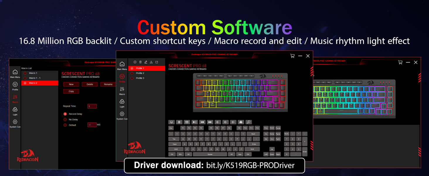 Pichirlash - tinch yozish va oxirgi marta qurilgan -Kerakli dasturiy ta'minotni darhol amalga oshiradigan 4 ta dasturning makro tugmachalarini (G1-G4) dasturi. O'yinlar uchun kompleks birikmalar, unumdorlik yoki ommaviy axborot vositalarining buyruqlari. Ish oqimingizni bir necha soniya ichida o'zgartiring. Siz funktsiyalarni sozlash, makros yaratish, RGB chiroqlarini sozlash va yorliqlarni o'rnatish uchun dasturiy ta'minotdan foydalanishingiz mumkin. Dasturiy ta'minot havolasi: bit ./k524rgbbbbbbbbriver