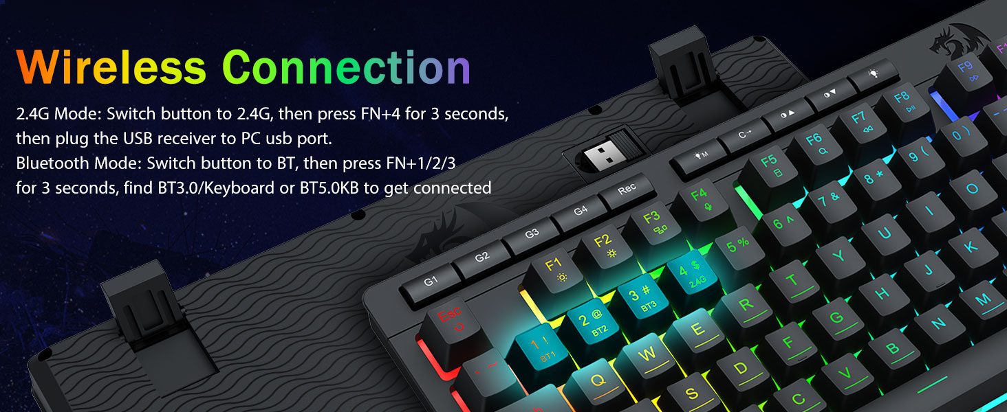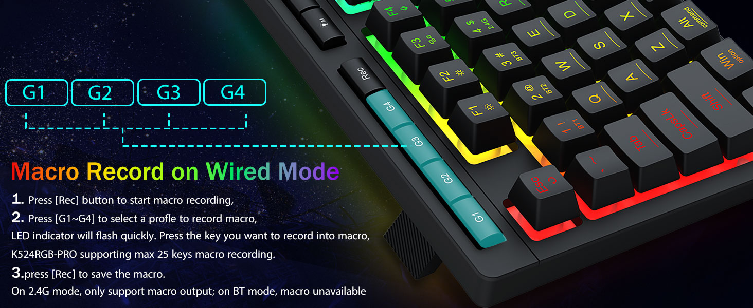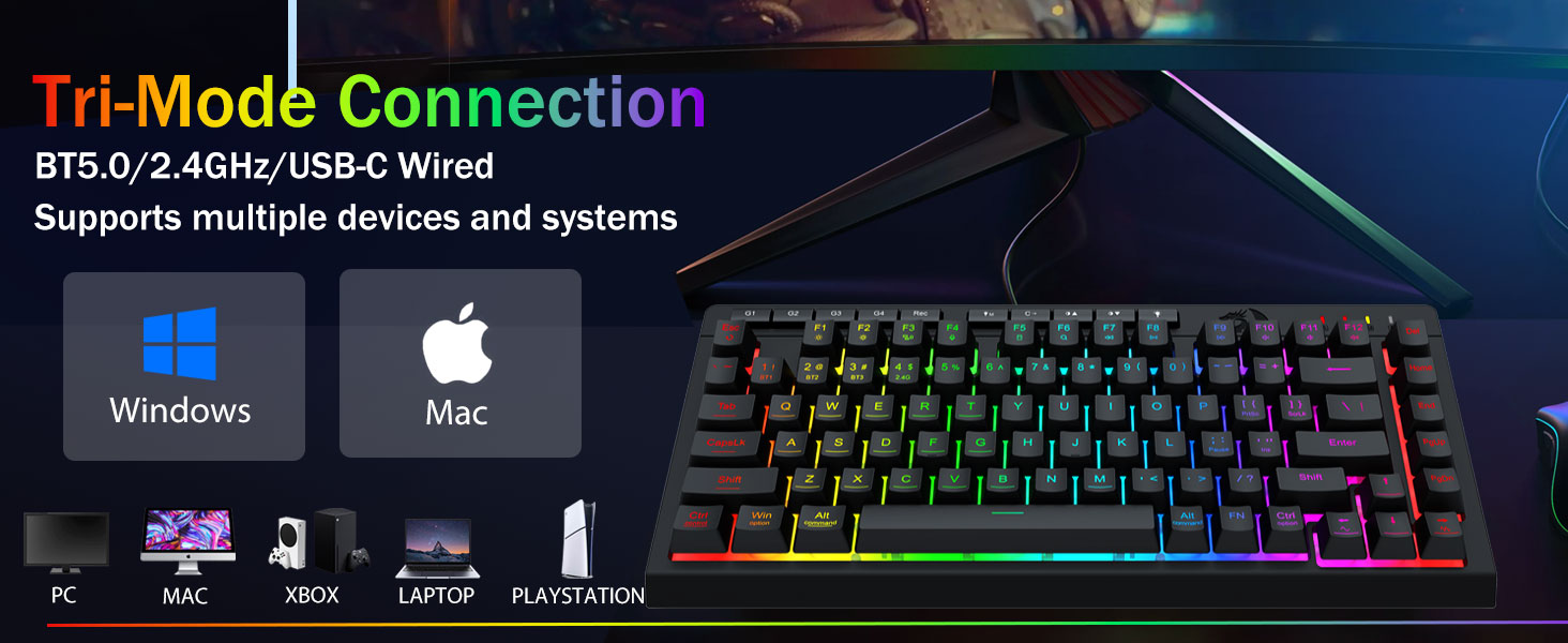 Tri-Mode va ko'p qurilmaning ko'priki- Bluetooth 5.0, 2.4Gz simsiz yoki USB-C simli rejimlari bilan bir vaqtning o'zida 5 ta qurilma (kompyuter, Mac, planshetlar, telefonlar, plan / xbox) o'rtasida bemalol aylantiring.