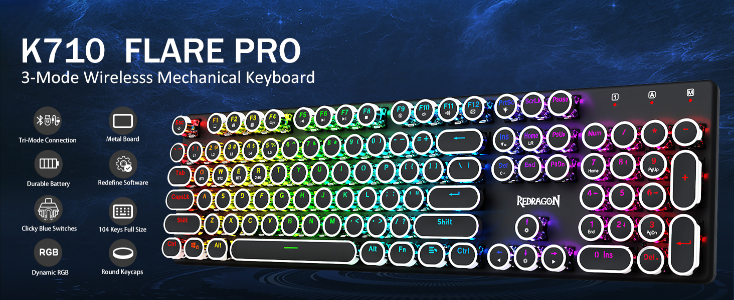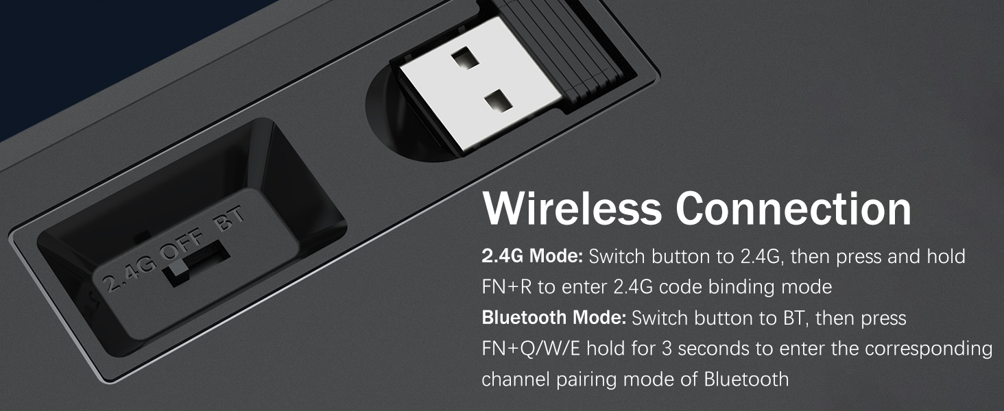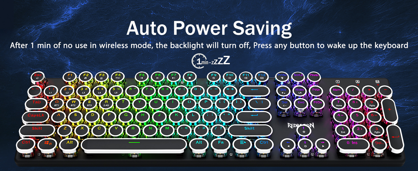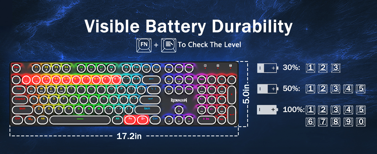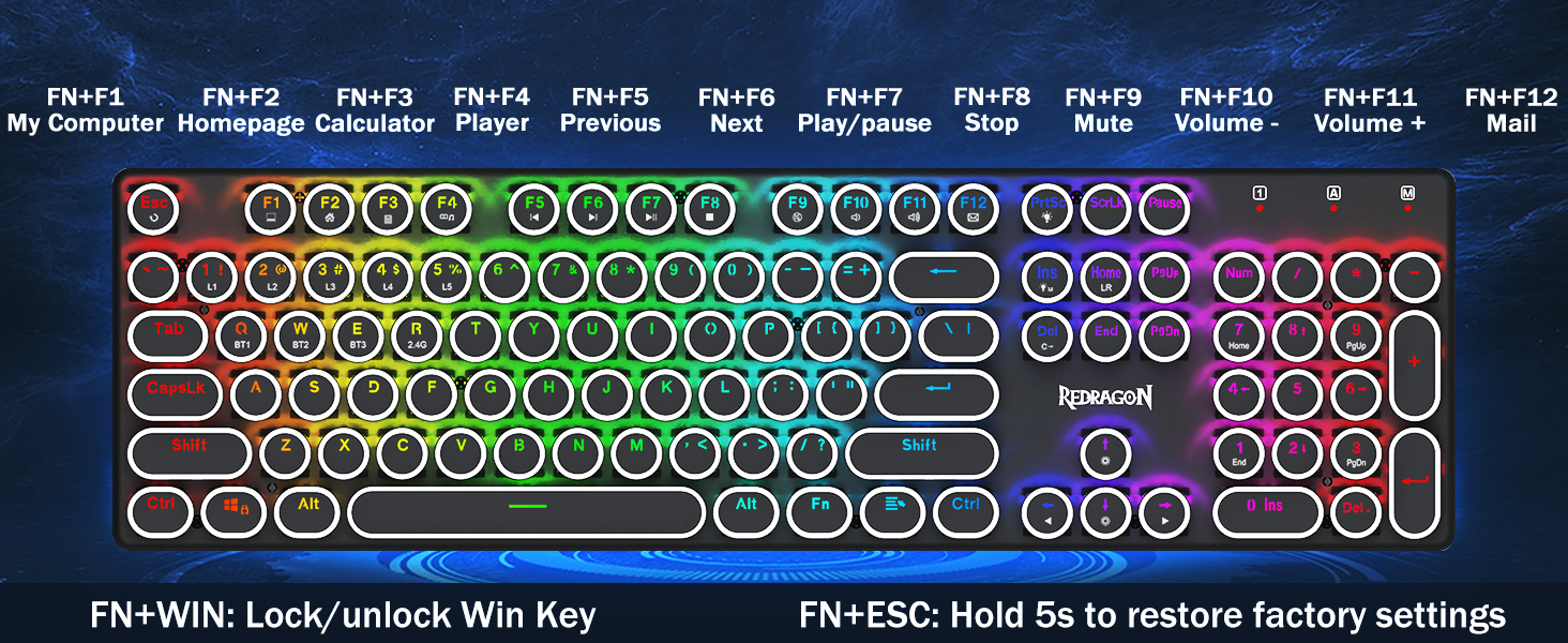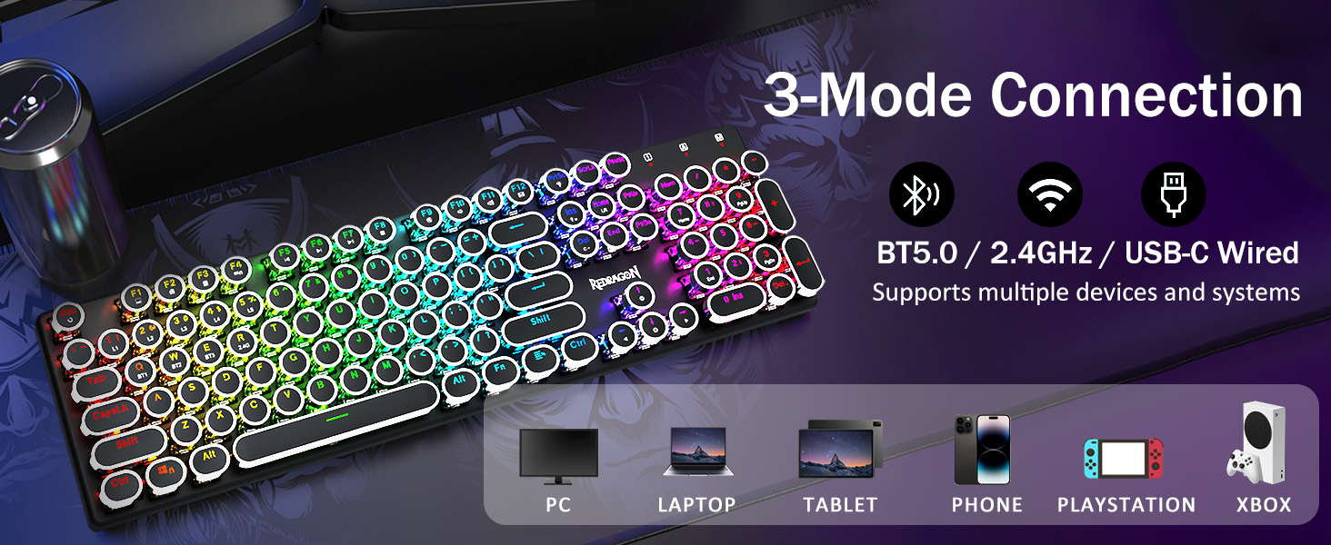 𝟯 - 𝗠𝗼𝗱𝗲 -Redragon Innovatsion Tri-Mode ulanish texnologiyasi, USB-C simli, Bluetooth 5.0 / 3.0 & 2.4QTz simsiz rejimlari, u barcha maydonlarda boshqa darajaga yangilangan simsiz rejimlar. FN + Q / W / E-ni Bluetooth Mode-ni bosing, FN + R-ni 2,4G rejimini bosing.