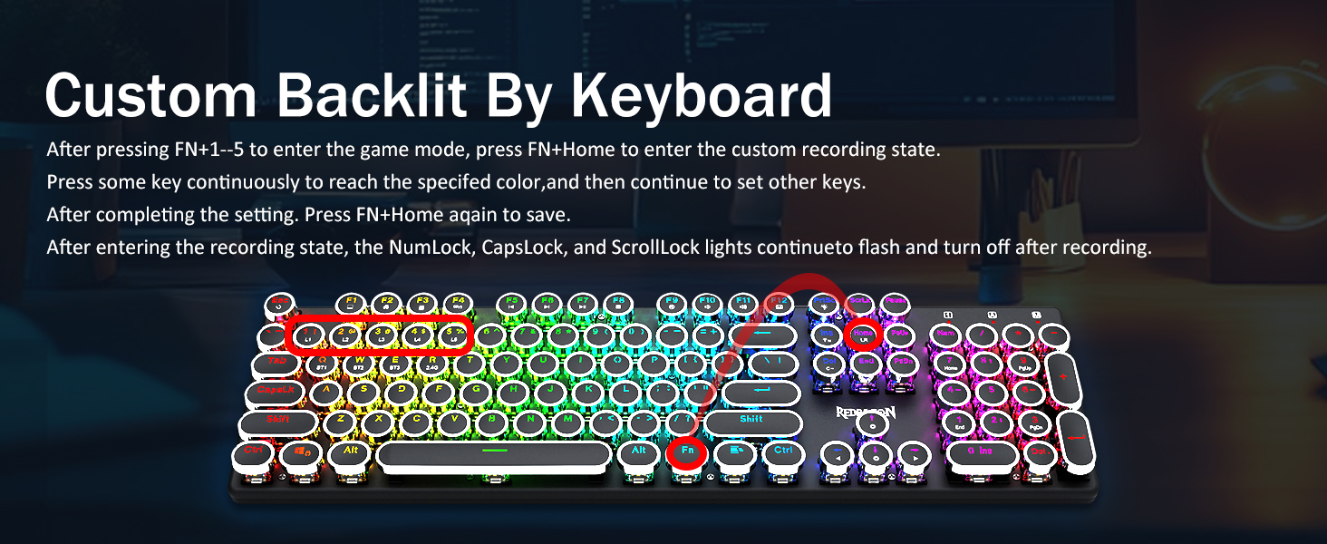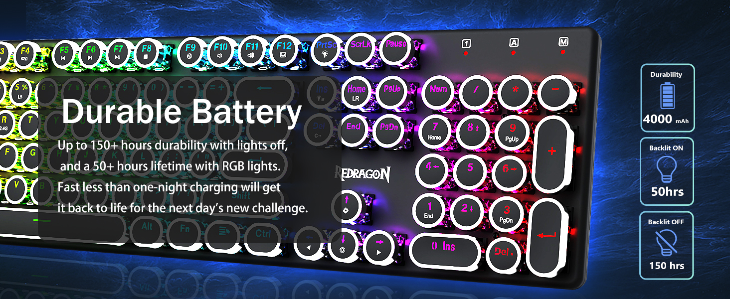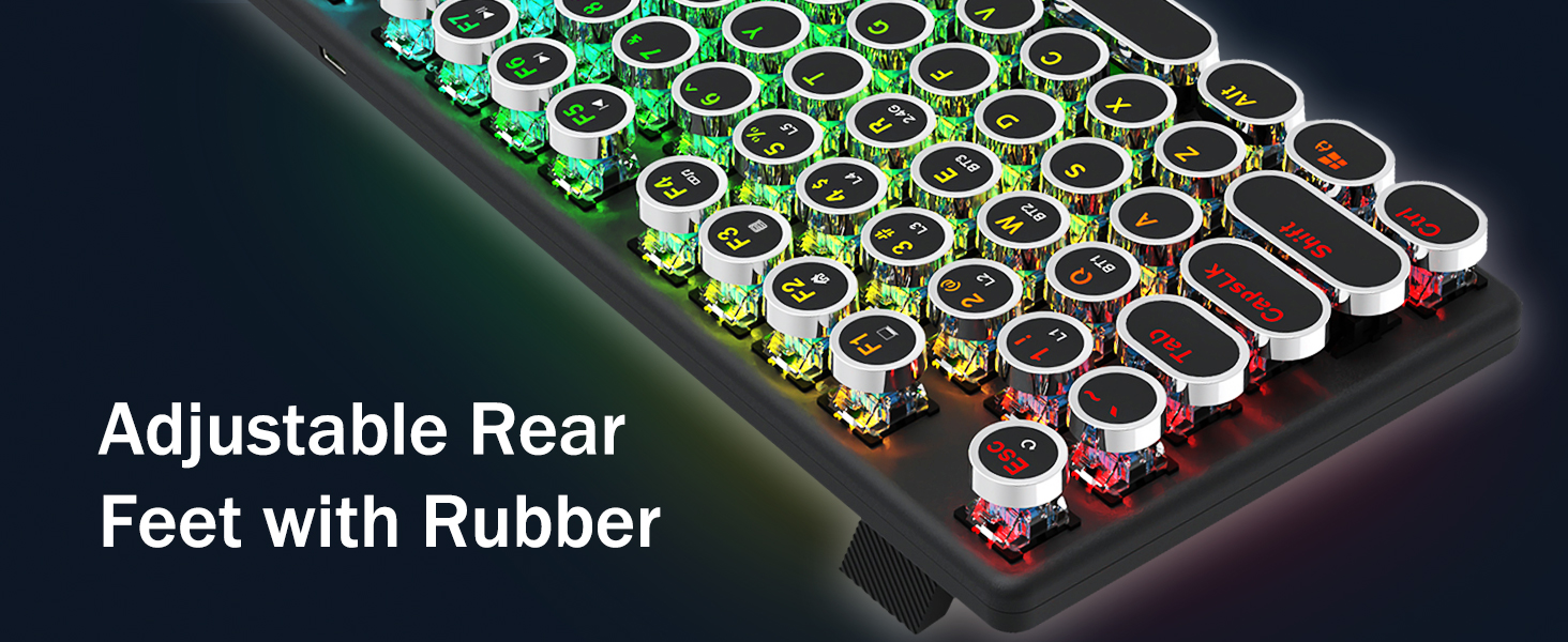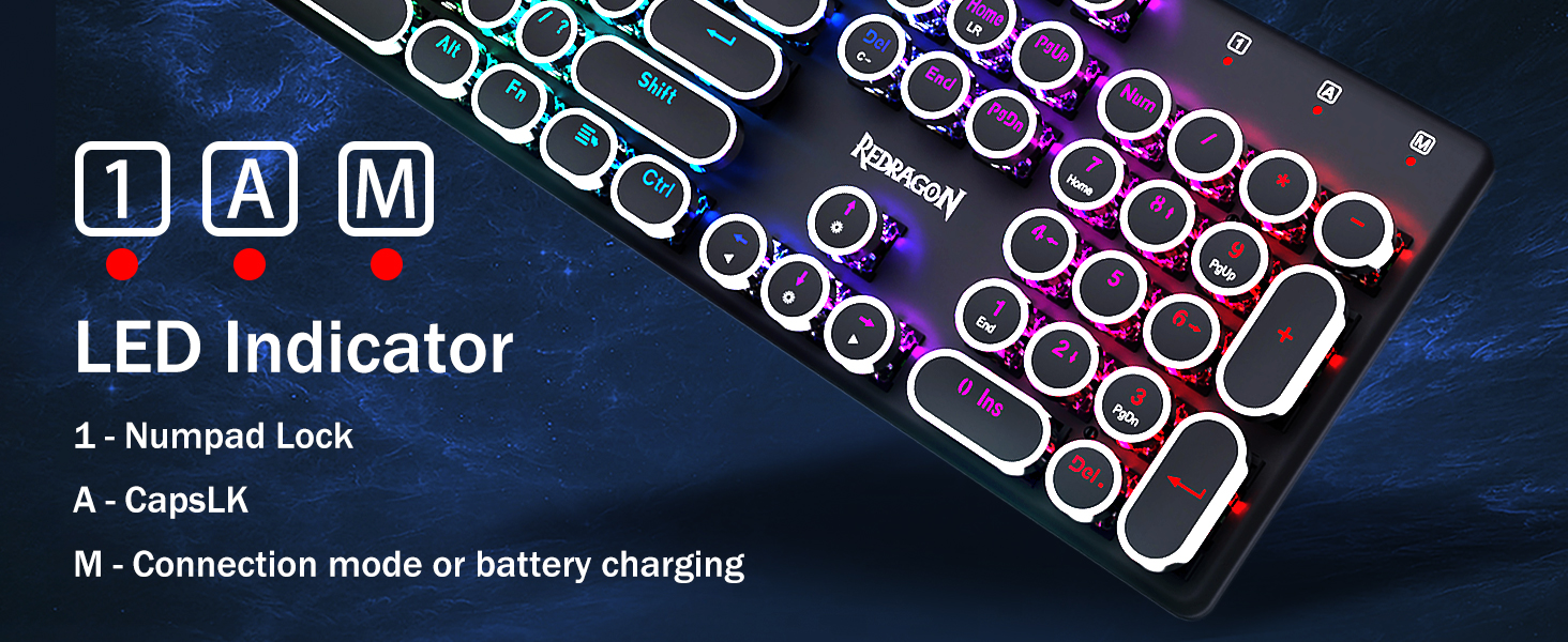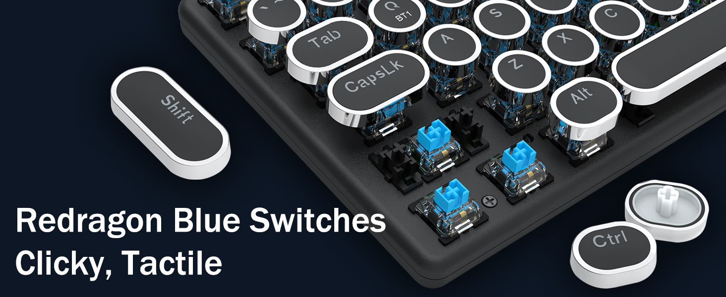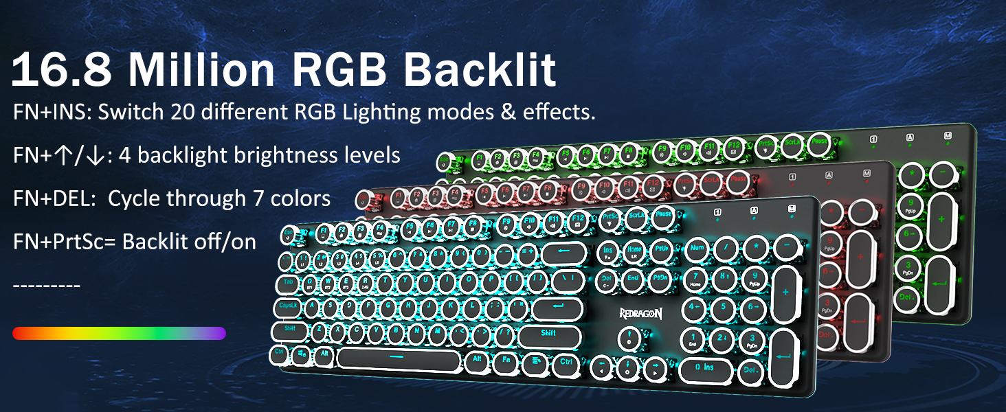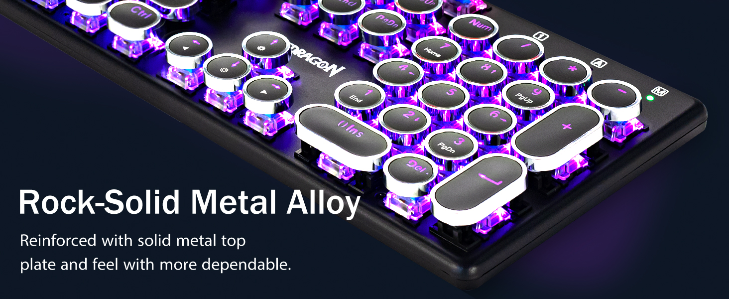 ① ② ③ ④ -Redragon mexanikasi O'rta qarshilikni taklif qiladi, ovozli klik pikselli tovush va taktil tovushlari, sezgir va aniq o'yin muhiti va ishlashini ta'minlaydi. Vintage bug'punk klaviaturasi Sight-ning klassik yozuv mashinkasiga o'xshaydi, sizga qulaylik hissi va tebranish teskari tugmachasini keltiradi.