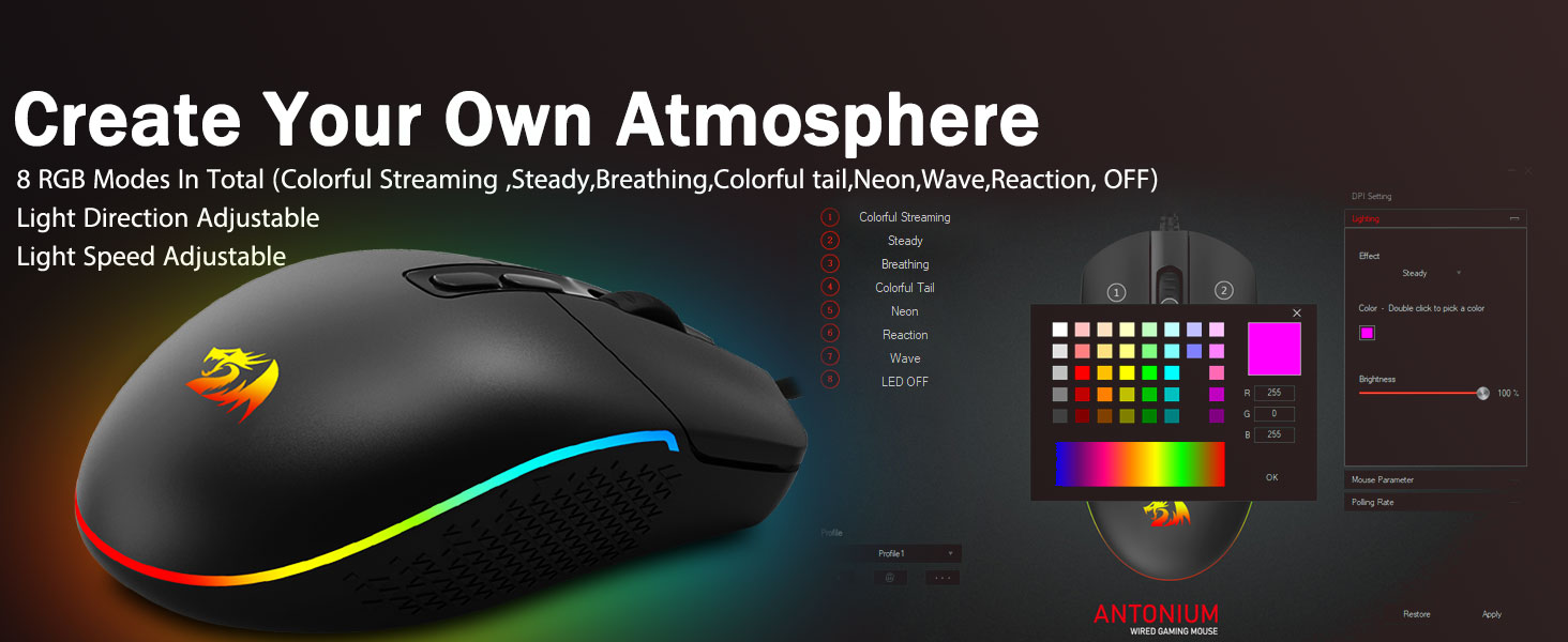 8 munosib RGB Backlit rejimlari- Backlitni yoqing va o'yin jang maydonida ba'zi o'ldiring. Iplangan dinamik RGB Backlit Vibe hech qachon sizni o'yin maydonchasini bezashda sizni hech qachon tushirmaydi, bu boshqa Redragon aksessuarlari bilan chiroqlar bilan yaxshiroq bo'ladi.