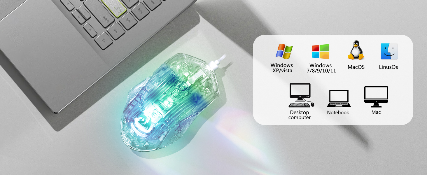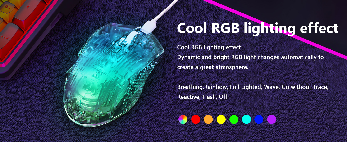 Sichqoncha ishlashga ta'sir qilmasdan vizual jozibadorlikni oshiradigan sakkizta RGB yorug'lik effektlarini o'z ichiga oladi. Foydalanuvchilar o'zlarining sozlamalari yoki shaxsiy xohishlariga mos ravishda yoritish rejimlarini almashtirishlari mumkin.